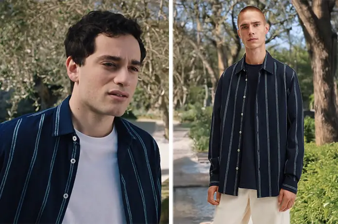 Tom Azem, interprété par Tom Darmon porte une chemise bleu marine à rayures dans Ici tout commence épisode 1167.