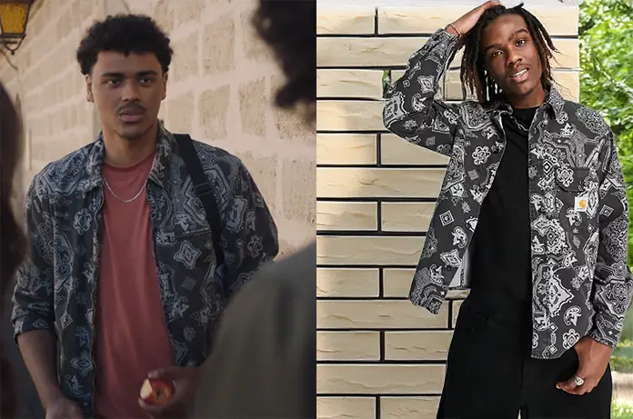Thomas (Jonathan Boin) quitte aussi l’Institut dans Ici tout commence épisode 1193. Il porte une chemise imprimé cachemire sur fond noir. Un modèle Carhartt Wip.
