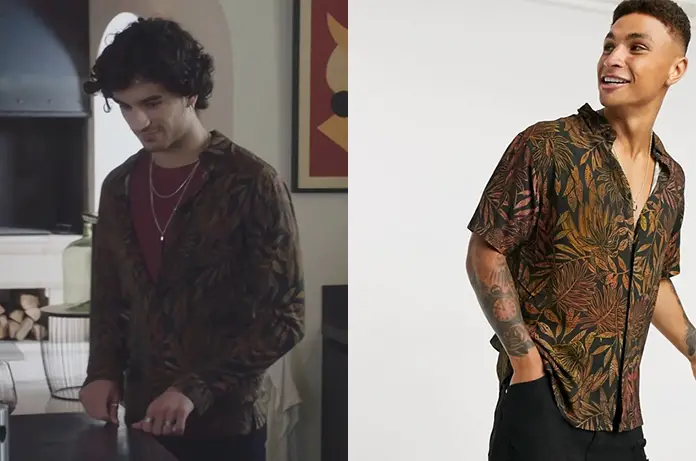 Tension de plus en plus vive entre Greg (Mikaël Mittelstadt) et son père à la fin d’Ici tout commence 102. Il porte une chemise avec un imprimé feuilles. On l’a retrouvée avec des courtes manches, ici.