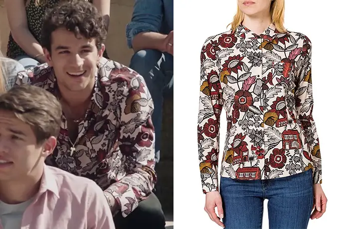 Tout comme Enzo ou Eliott, Greg (Mikaël Mittelstadt) peut choisir ses chemises au rayon filles… C’est le cas de cette chemise imprimée, vue dans Ici tout commence 416. On la trouve ici.