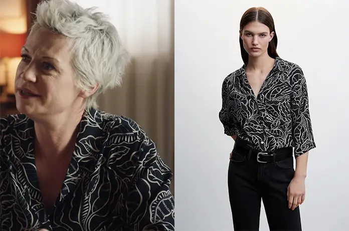 Dans l’épisode 736 d‘Ici tout commence, Olivia (Virginie Caliari) porte une chemise noire avec un imprimé végétal blanc.