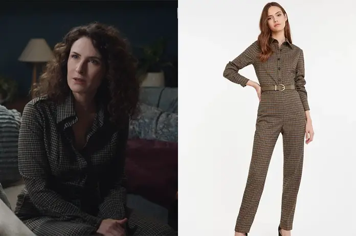 Coup de massue pour Clotilde Armand (Elsa Lunghini) dans Ici tout commence 292. Elle porte une combinaison pied-de-poule aux manches longues.