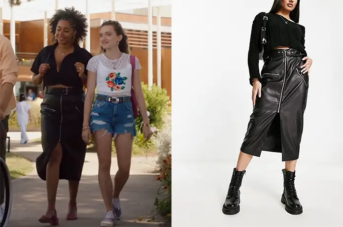Dans Ici tout commence épisode 738, Billie (Margaux Aguilar) rend visite à Enzo dans une jupe de biker en simili-cuir.
