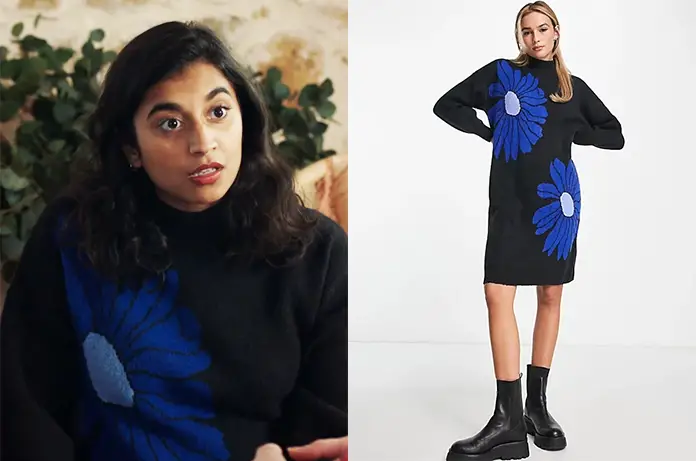 Deva (Kathy Packianathan) porte cette robe noire avec deux fleurs bleues géantes du côté face, dans Ici tout commence 611.