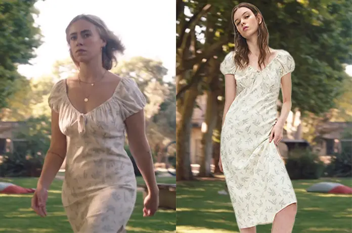 Zoé (Maïa Bringue) porte une robe avec encolure en forme de cœur munie de petits liens à nouer devant, avec un imprimé floral, dans Ici tout commence épisode 1272.