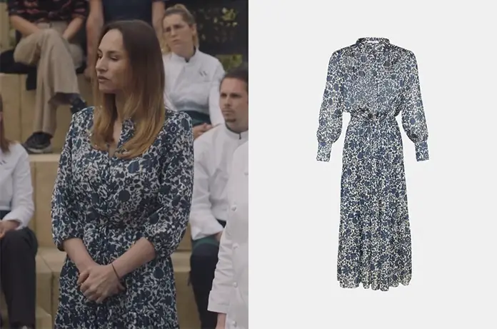 Dans Ici tout commence 181, Rose Latour (Vanessa Demouy) assiste à la remise des diplômes de 3e année avec cette belle roble ) fleurs bleues.