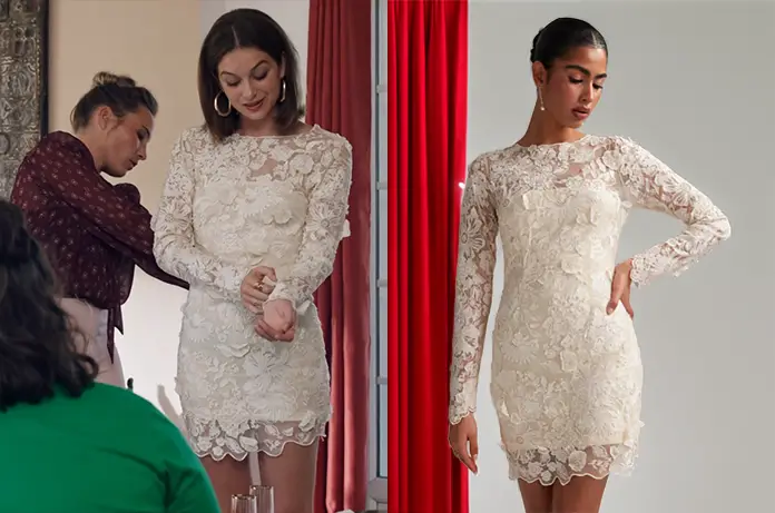 Carla (Aaricia Lemaire) essaie la robe de mariée de sa grand-mère dans Ici tout commence épisode 1288. Un joli modèle brodé, court, avec des longues manches. Sera-ce la bonne ?