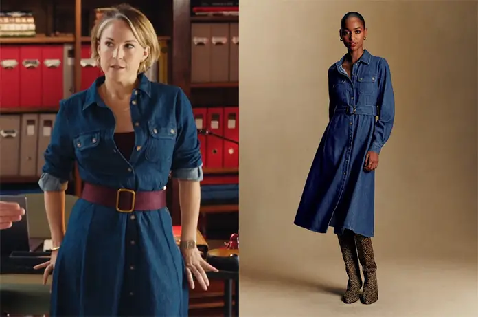Jeanne (Aurélie Vaneck) discute du cas Revero dans Ici tout commence épisode 1349. La jeune femme porte une robe chemise en denim bleu.