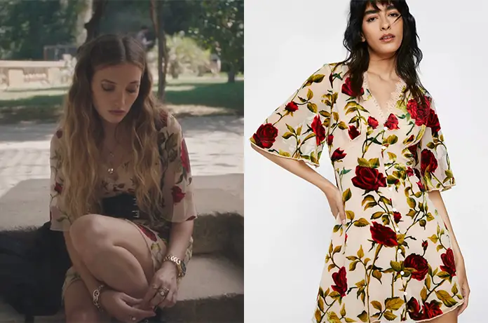 Vic Rochemont (Lou Ladegaillerie) semble attristée par le désaccord qui la lie à sa soeur, dans Ici tout commence… Elle n’en porte pas moins de manière exquise une petite robe fleurie que l’on trouve ici.