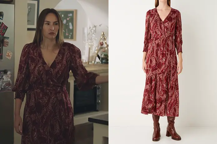 Rose (Vanessa Demouy) prend la défense de Souleymane dans Ici tout commence 284. Elle porte une robe cache-cœur imprimée dans des teintes bordeaux.