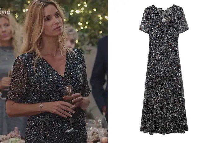 Chloé (Ingrid Chauvin) portait cette jolie robe marine à motifs dans Ici tout commence 40. Chloé portait déjà cette robe pour son réveillon 2019.