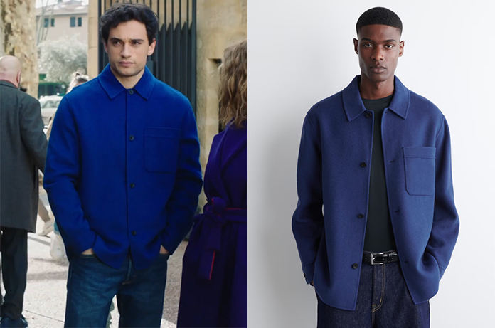 Tom (Tom Darmon) est toujours prêt à aider Jasmine dans Ici tout commence épisode 1409. Le jeune homme porte une surchemise bleu cobalt dispo ici. La coupe est droite, type « veste de travail », avec un col chemise classique et une poche plaquée sur la poitrine.