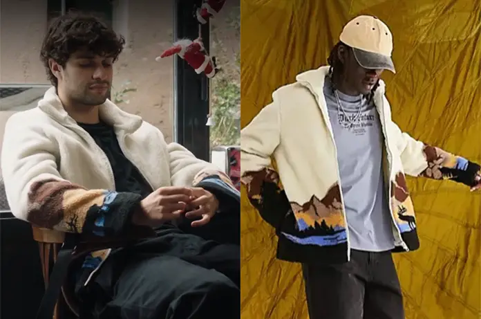 David (Liam Hellmann) porte une veste en imitation peau de mouton avec un imprimé paysage de montagne, dans Ici tout commence épisode 566.