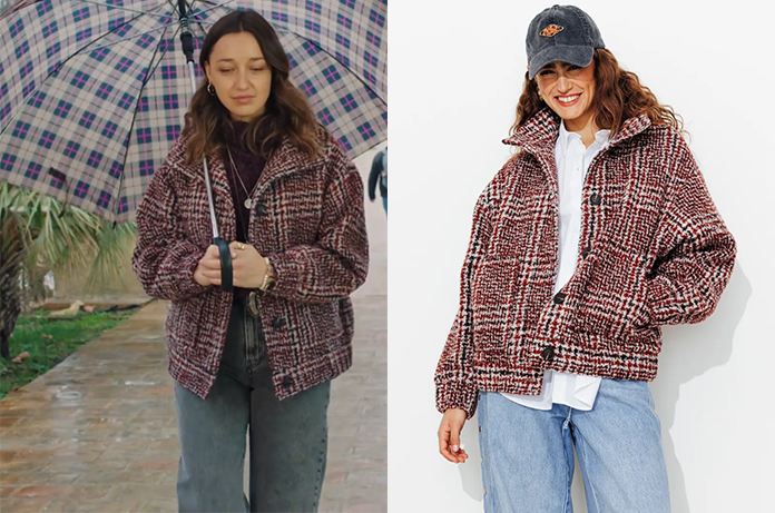 On remarque un vrai changement pour Jasmine (Zoï Sévérin) dans cet épisode 1471 d’Ici tout commence. Elle délaisse ses tenues bohèmes — ses longues jupes et ses imprimés fleuris des derniers jours — pour une silhouette nettement plus assagie. Ce blouson en tweed Promod agit comme une armure chic : le passage de la fluidité à la rigueur du tweed souligne une Jasmine plus posée, peut-être prête à affronter des responsabilités plus sérieuses.