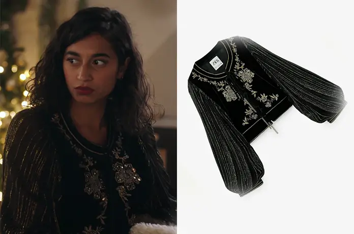 Deva (Kathy Packianathan) porte, dans Ici tout commence 553, cette veste en velours noir, avec des manches ballons. Il s’agit d’un modèle Zara qu’on trouve encore sur des sites de seconde main. Comme ici