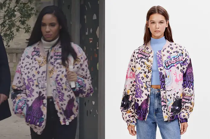 Marta (Sarah Fitri) se fait accoster dans ici tout commence 26. Elle porte un blouson oversize avec tigres, zèbre que l’on trouve ici, à 19.99€