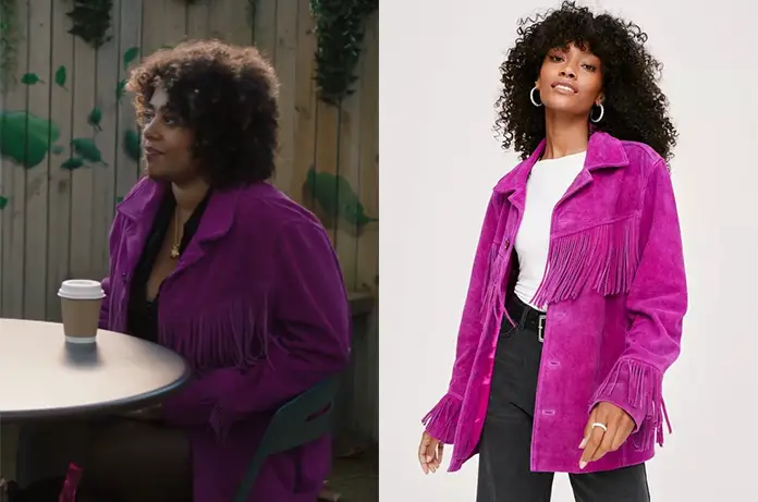 Billie (Margaux Aguilar) a mis une nouvelle veste en daim violette dans Ici tout commence 568.
