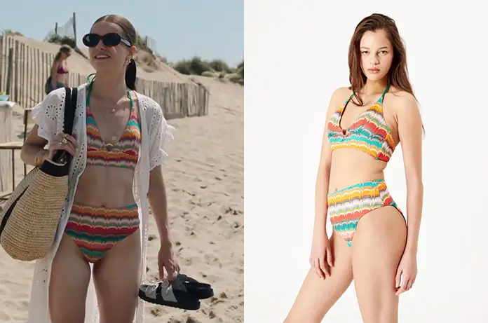 Une aprèm à la plage avec Anaïs (Julie Sassoust) dans Ici tout commence 443. Elle a choisi une tenue 70’s avec ce bikini bariolé. On le trouve ici (du moins la culotte taille haute)