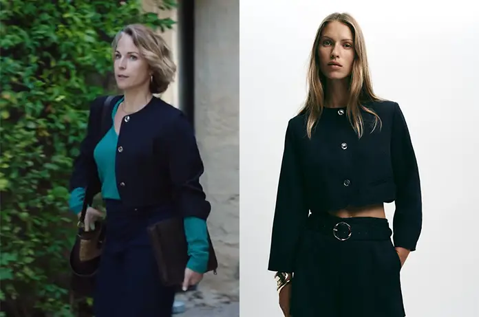 Dans Ici tout commence épisode 1313, Jeanne (Aurélie Vaneck) se promène dans les jardins de l’Institut Armand avec un blazer court bleu marine, aux boutons dorés.