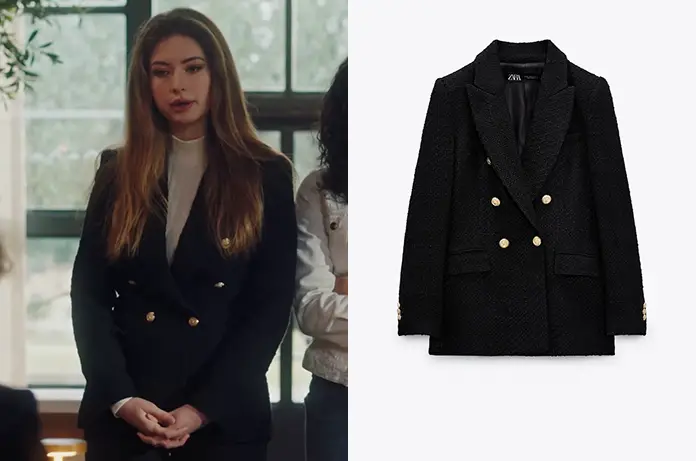 Dans Ici tout commence 380, pour son conseil de discipline, Charlène (Pola Petrenko) a misé sur un strict blazer noir, avec boutons métalliques. On le trouve ici
