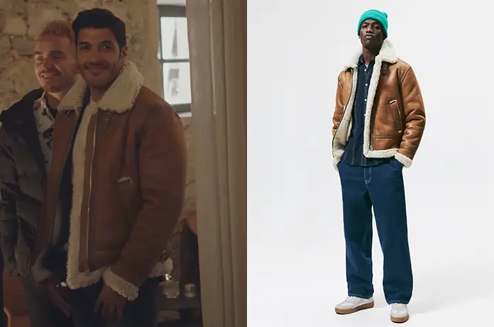 On voit beaucoup le comédien Janis Abrikh cette semaine : dans la série Emily in Paris dont la deuxième saison a été lancée hier sur Netflix, et dans Ici tout commence où il revient à l’Institut Armand pour fêter Noël sous les traits de Joachim Gueraud. Dans cet épisode 300 du soap de TF1, il porte une veste couleur caramel avec intérieur imitation mouton.