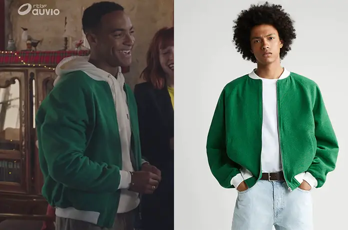 Solal (Benjamin Douba Paris) portait au-dessus de son sweat blanc un bomber vert avec un col des des poignets blancs. On le trouve ici
