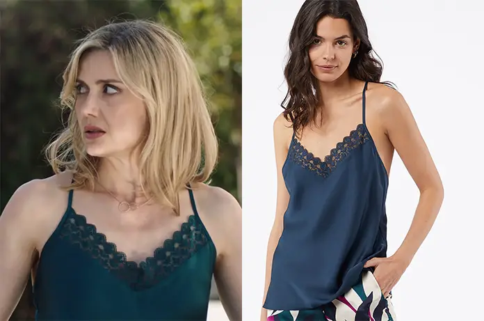 Elle porte un petit caraco bleu, d’une ancienne collection Etam.