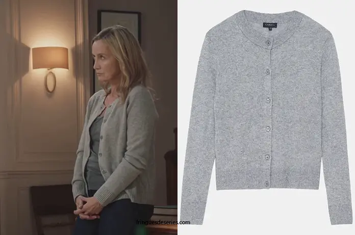 Claire (Catherine Marchal) prend de nouvelles décisions dans Ici tout commence 45. Elle porte un ravissant petit cardigan gris boutonné, à col rond.