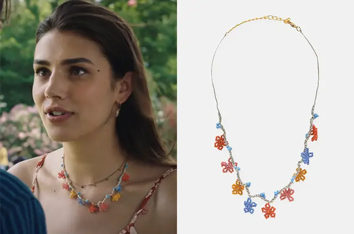 Dans Ici tout commence, Maya (Alexandra Favalli) porte souvent un collier de fleurs. Il s’agit d’un collier fantaisie qu’on trouvait chez Pull&Bear.