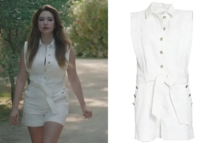 Charlène (Pola Petrenko) retrouve Louis, dans Ici tout commence 205, avec un combishort boutonné blanc. On le trouve ici