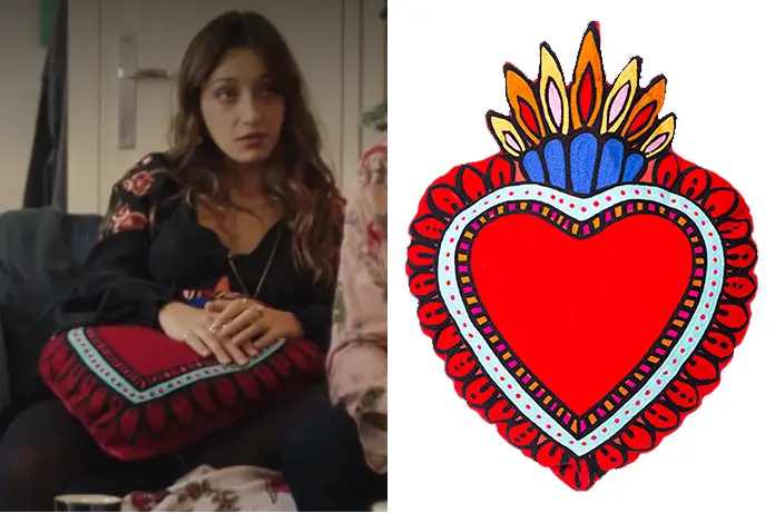 Dans Ici tout commence 557,Jasmine (Zoï Séverin) tripote un coussin rouge en forme de cœur. Ce coussin, inspiré des cœurs ex-voto du Mexique, se trouve ici ou ici