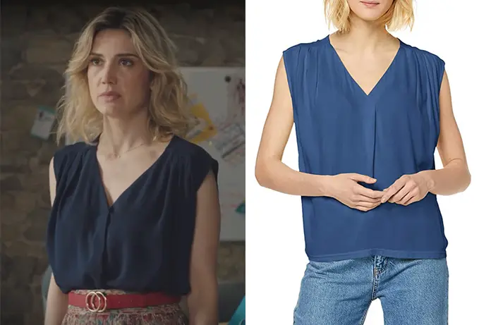 Constance (Sabine Perraud) découvre quelque chose dans son infirmerie qui la glace, dans ici tout commence 181. Elle porte un top bleu que l’on trouve ici