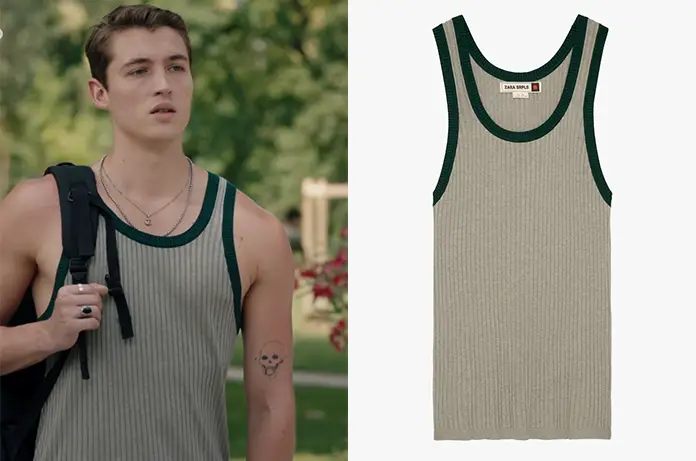 La première apparition de Jim Leroy (Loan Becmont) se fait dans ce débardeur côtelé, dans Ici tout commence épisode 738.