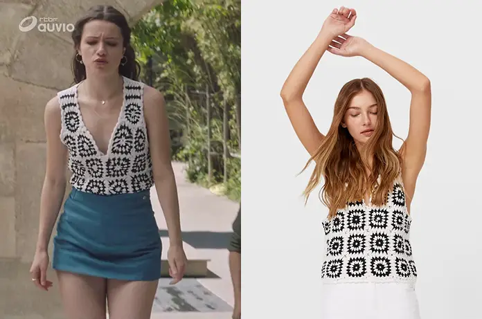 Anaïs (Julie Sassoust) repart contrariée de l’Institut dans l’épisode 188 d’Ici tout commence. Elle porte, pourtant, un bien joli gilet en crochet npir et blanc que l’on trouve ici.