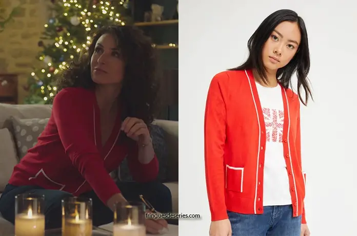 Clotilde (Elsa Lunghini) va se disputer avec son mari dans l’épisode 19 d‘Ici tout commence. Elle porte un ravissant cardigan rouge à poches que l’on trouve ici.
