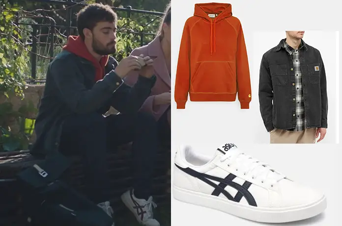 On s’arrête aujourd’hui sur le look de Maxime (Clément Remiens) dans Ici tout commence 293. Sous sa veste noire que l’on trouve ici, Maxime porte un sweat orange de la même marque.