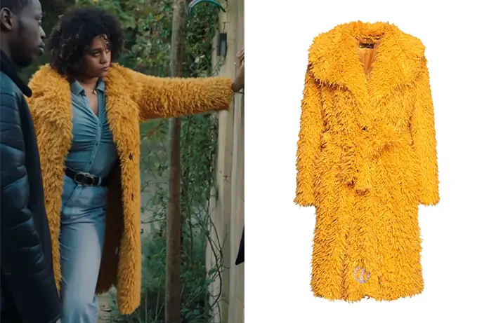 Billie (Margaux Aguilar), confrontée à ses remords d’être entrée dans le Cercle, porte , dans Ici tout commence 579, un long manteau jaune, en fausse fourrure.