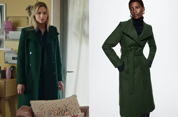 Dans Ici tout commence épisode 564, Salomé (Aurélie Pons) porte un manteau vert, d’un beau vert sapin, avec une ceinture amovible.