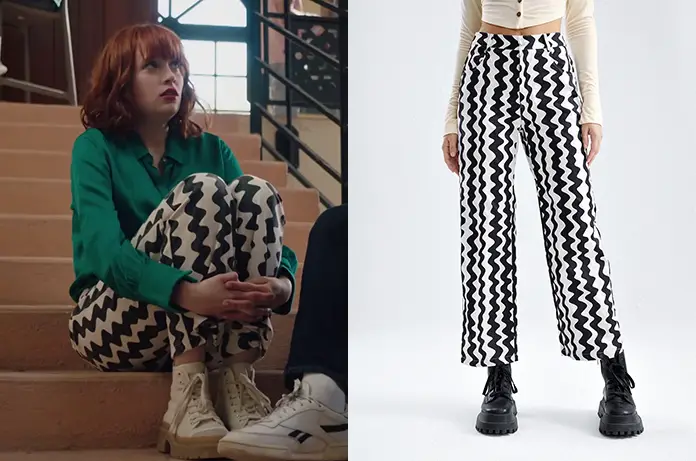 Ambre (Claire Romain) portait un curieux pantalon blanc, avec un imprimé de vagues noires dans Ici tout commence 419. On le trouvait ici