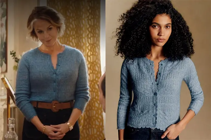 Jeanne (Aurélie Vaneck) porte un petit gilet bleu en kid mohair et laine mérinos dans une maille ajourée dans Ici tout commence épisode 1354.