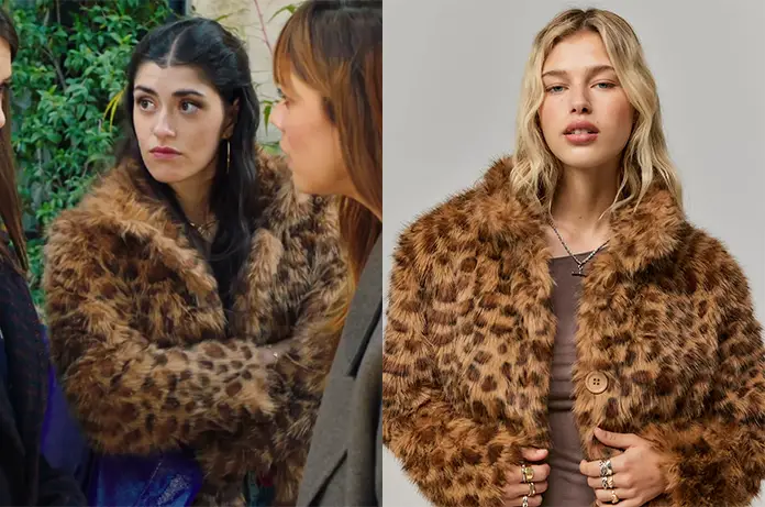Bianca (Alexandra Ferreira) défend la position de Ninon dans Ici tout commence épisode 1325. Elle a choisi un manteau en fausse fourrure imprimé léopard pour sortir ses griffes ; elle était disponible ici.