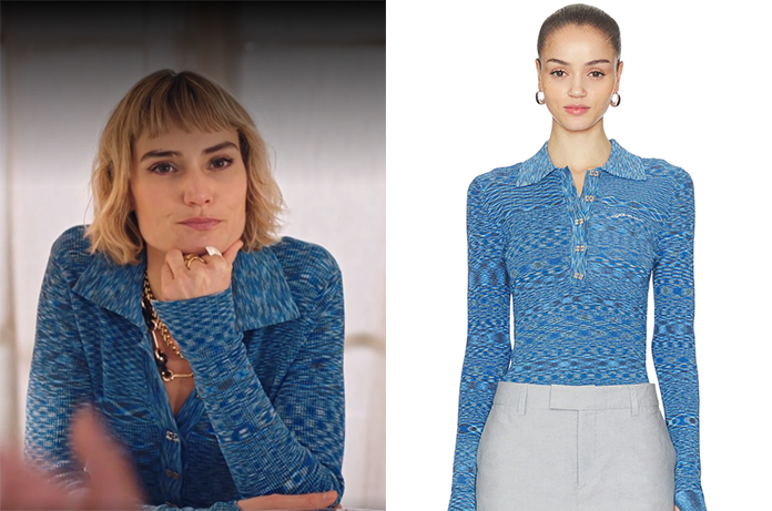 Anouk (Vanille Lehmann) porte ce polo avec un imprimé abstrait bleu dans Ici tout commence épisode 1400. On le trouve ici et ici.