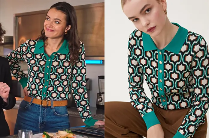 Anaïs (Julie Sassoust) porte un pull boutonné avec des motifs qui font très 70’s dans Ici tout commence épisode 1322.