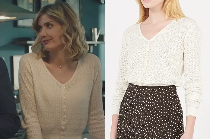 Constance Teyssier porte un ravissant petit pull fantaisie avec des boutons décoratifs dans Ici tout commence 130. On le trouve ici