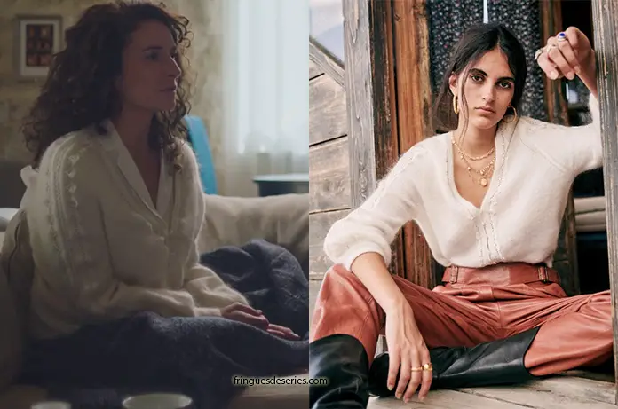 Le pull écru à empiècements en dentelles de Clotilde (Elsa Longhini) vu dans Ici tout commence 48 est malheureusement sold out. Il s’agissait du modèle Valentine de la marque Sezane.