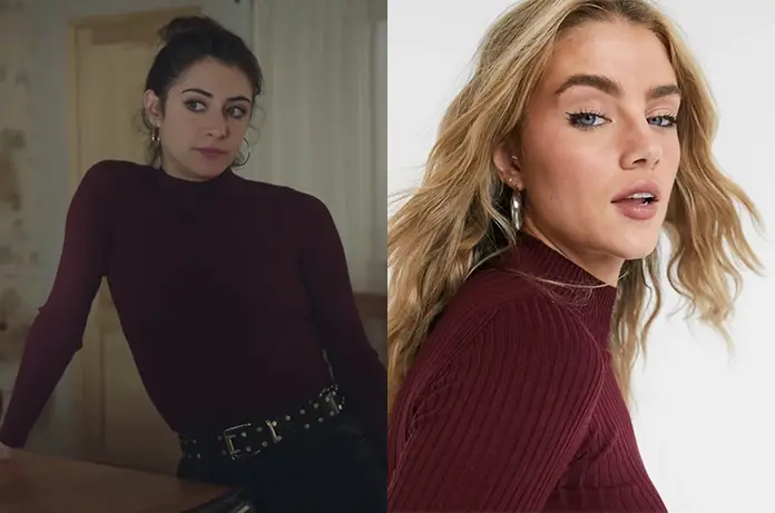 Célia (Rebecca Benhamour) porte un pull bordeaux à col montant dans Ici tout commence 52. De la marque Bershka, il n’est plus disponible.