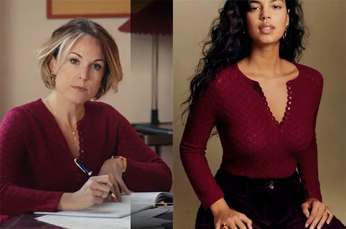 Dans Ici tout commence épisode 1353, Jeanne (Aurélie Vaneck) porte un pull grenat au col boutonné.