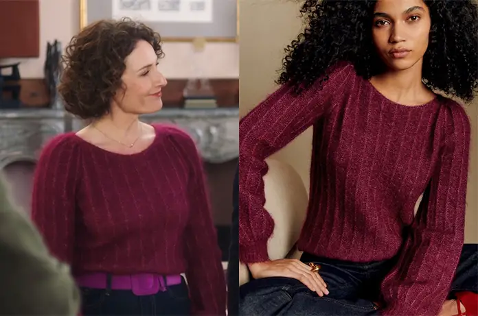Clotilde (Elsa Lunghini) porte ce joli pull grenat dans Ici tout commence épisode 1376.