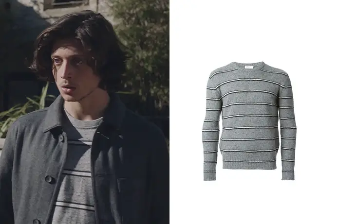 Jérémy (Pierre Hurel) ne sait pas encore qu’il va se ramasser une belle raclée dans son joli pull gris rayé à col rond. Cela se passe dans Ici tout commence épisode 47. Si vous le recherchez, il faudra faire un tour de friperies qui vendent du Saint Laurent.