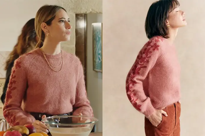 Alice (Noémie Zeitoun) porte un joli pull rose avec des motifs floraux sur les manches dans Ici tout commence épisode 1363.